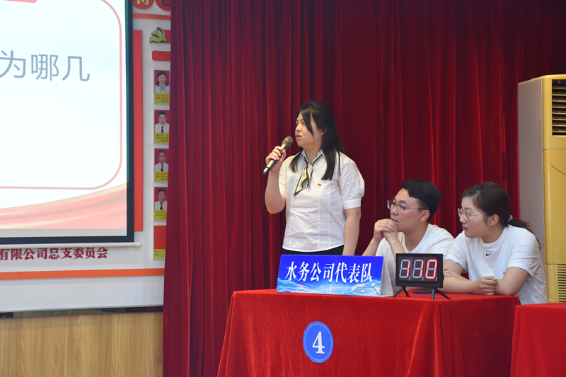 此次比賽分為小組共答題、個人必答題、搶答題、你劃我猜、風險題五種形式,并分五輪進行。共有五支代表隊參賽,分別是惠民、自來水、龍泉、水務、污水公司代表隊,且每個代表隊人員都是經過層層篩選脫穎而出的。大家顯然是有備而來的,競賽過程精彩激烈,參賽選手們有的運籌帷幄、有的胸有成竹、有的應對自如,各代表隊你追我趕、搶答器的聲音此起彼伏,現場戰況異常激烈,展示出了新時代水務公司團員青年的風采。