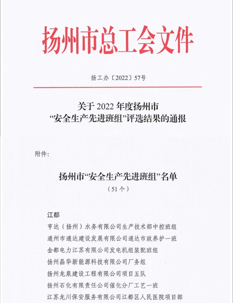 龍泉公司項目五隊榮獲2022年度揚州市 “安全生產先進班組”
