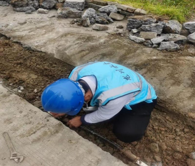 12月19日上午8點,南片維修所接到客服報修,反映宜陵鎮七里張營紅綠燈處挖機挖路導致管道破裂漏水嚴重,且漏水點在路邊,行人來往頻繁,存在安全隱患。我片區維修作業人員喬金于立即趕往現場查看,經過實地查勘,最終探明漏水原因是PVC32管道破裂。隨后,喬金于不顧天氣寒冷,脫掉厚外套,穿上雨靴,立即開展搶修工作。零下的寒冬里,路上的行人包裹得嚴嚴實實,但搶修管道的工作人員沒有絲毫懈怠,干得熱火朝天,汗水打濕了衣服。喬金于先用鐵鍬一鍬一鍬的挖開泥土,把管道暴露出來,隨即雙腳站在泥土中,用角鋸鋸開管道,對破損的PVC32管更換伸縮節。經過一套行云流水般的操作,此次搶修工作圓滿完成,恢復正常供水。