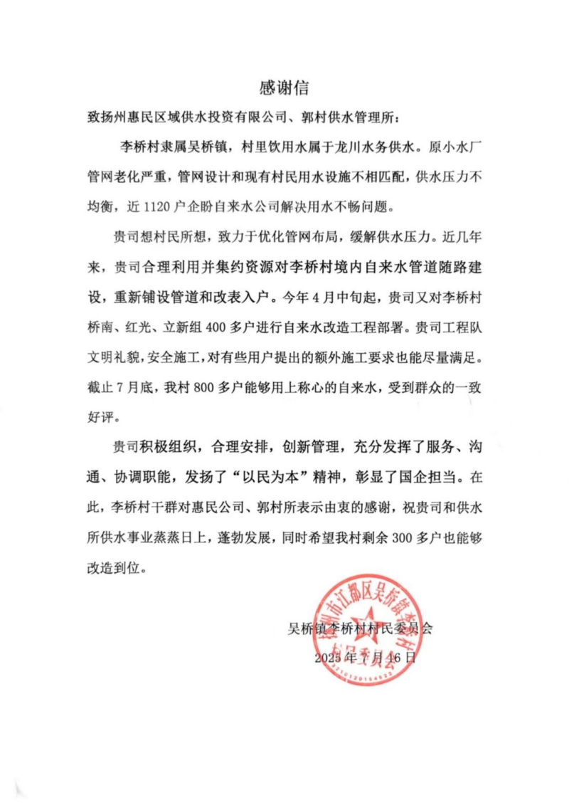 捧著這封沉甸甸的感謝信,惠民區(qū)域供水公司負(fù)責(zé)人蔣珀表示,收到這封感謝信既是肯定也是鞭策。目前李橋村自來水改造項目還在實施中,預(yù)計今年10月底竣工,改造工程完工后,李橋村的自來水供水能力和水質(zhì)將得到顯著提升,能夠徹底解決村民的用水“煩心事”,村民的認(rèn)可就是我們工作的最大動力,保障群眾用上“放心水、滿意水”是我們的職責(zé)所在。今后,惠民區(qū)域供水公司將繼續(xù)聚焦群眾用水需求,不斷提升供水服務(wù)質(zhì)量,讓更多群眾享受到更為優(yōu)質(zhì)、便捷的供水服務(wù),讓更多村組享受到優(yōu)質(zhì)的供水服務(wù),把民生工程做到群眾心坎上。用實際行動踐行“為民辦實事”的承諾。